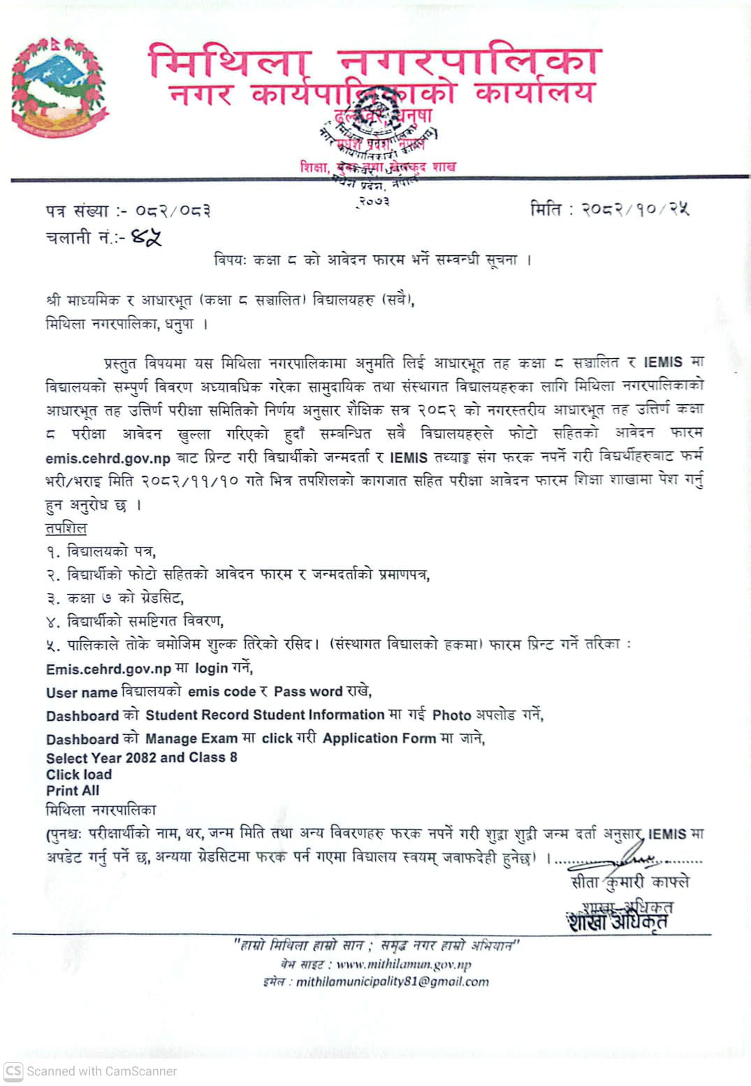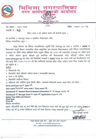 » कक्षा ८ को आवेदन फारम भर्ने सम्बन्धि सूचना - श्री (माध्यमिक र आधारभूत विद्यालयहरु सबै) मिथिला नगरपालिका ।