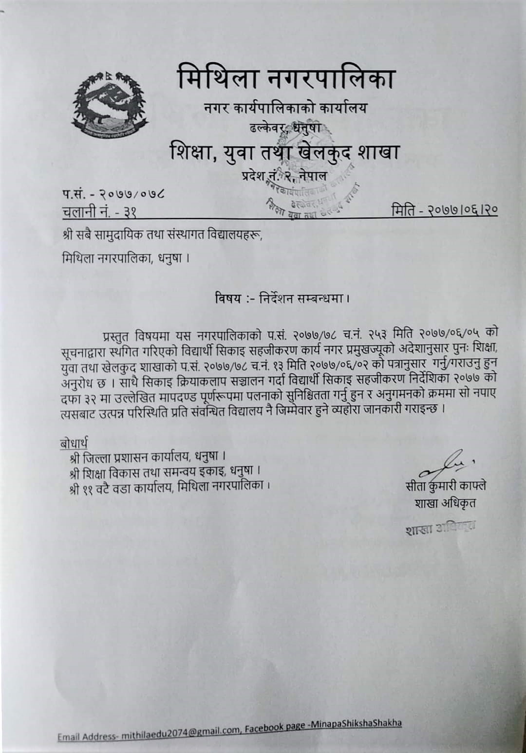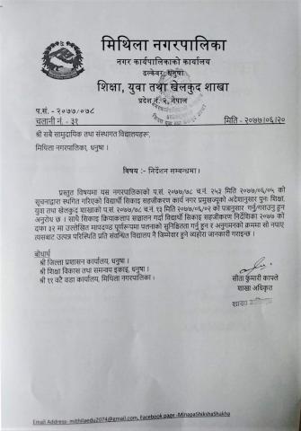 » निर्देशन सम्वन्धमा - श्री (सम्पुर्ण समुदायिक तथा संस्थागत विद्यालयहरू ) मिथिला नगरपालिका ।