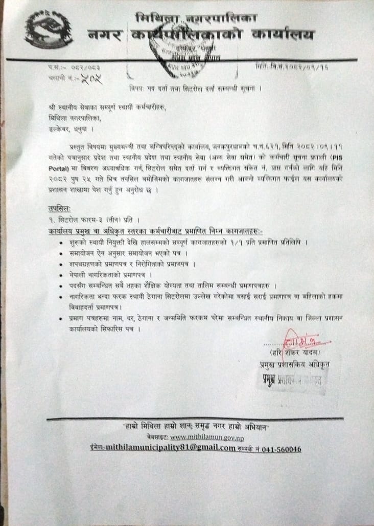 मिथिला नगरपालिका, नगर कार्यपालिकाको कार्यालयकाे नागरिक वडा पत्र.......