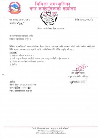 कार्यपालिका बैठक सम्बन्धमा - श्री (कार्यपालिका सदस्यहरु सबै) मिथिला नगरपालिका ।
