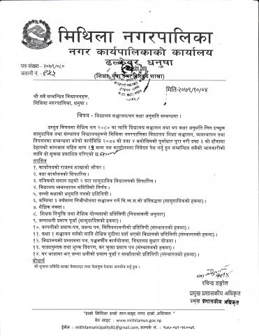 » विद्यालय संचालन तथा थप कक्षा अनुमति सम्वन्धमा - श्री ( सम्बन्धित सम्पूर्ण विद्यालयहरू ) मिथिला नगरपालिका , धनुषा ।